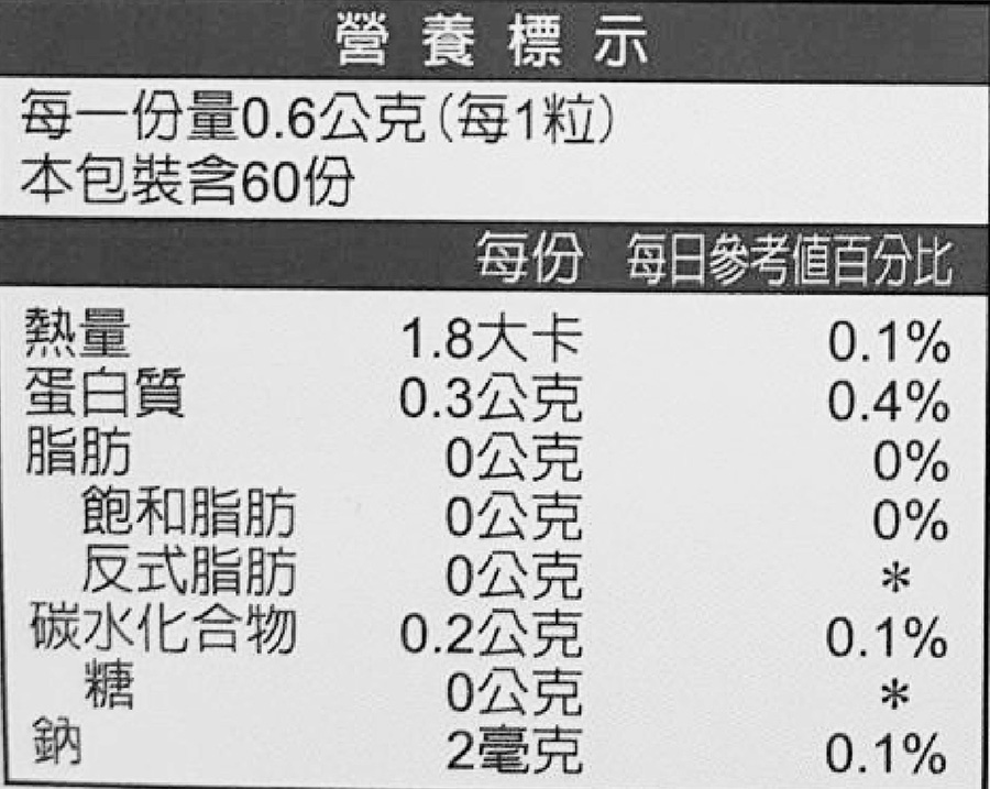 每日參考値:熱量200大卡、蛋白質60公克、脂肪60公克、飽和脂肪18公克、碳水化合物300公克、鈉2000毫克