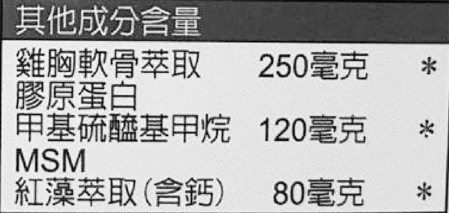 成分:雞胸軟骨萃取膠原蛋白(含第二型膠原蛋白,軟骨素,玻尿酸,葡萄糖胺),甲基硫醯基甲烷(MSM),紅藻萃取(含鈣),明膠,穿心蓮,薑黃,甘油,二氧化鈦。